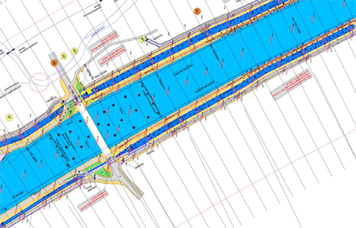 Von Querschnitten können Elemente entlang der Achse, Querschnittsgeometrie, Schnitt und Deiche (Dämme) übertragen werden. Wenn der Wasserspiegel berechnet wurde, können Wasserspiegelpunkte berechnet und in den Lageplan zur Visualisierung übergeben werden.